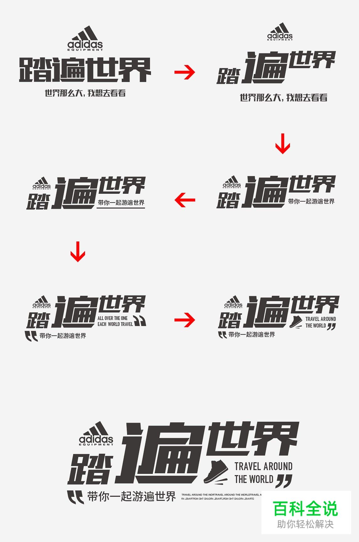 这类的文字编排在一些专题性的电商海报中很常见;很多人在拿到文案时就想一次完成编排,其实这对于排版能力稍薄弱的人来说是个误区,不断的尝试也是进步过程,通常一个组合式的文字排版都需要从最基础的信息罗列开始,通过尝试不同的方案选定最终的成品,比如这样的文案:“踏遍世界,带你一起游遍世界,adidas”,下面演示一下: