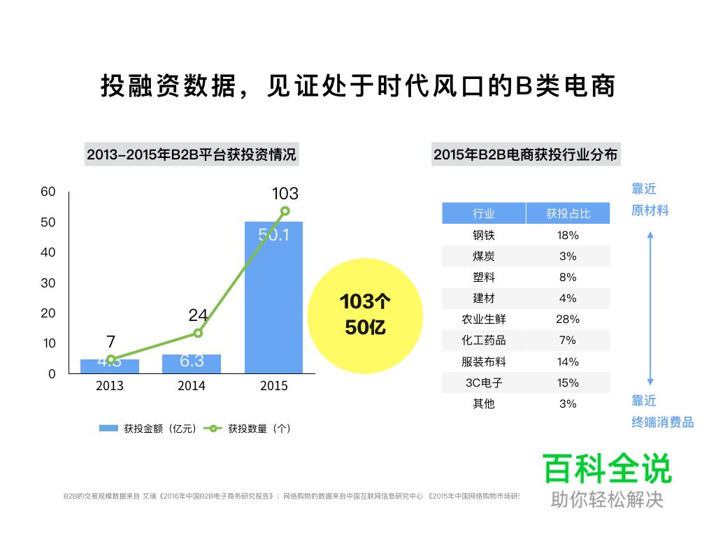 4、2015年获得投资的B2B平台为103个,投资额超过50亿元,获投行业遍布原材料端到消费品端,未来可预见时间仍是资本投资热点。