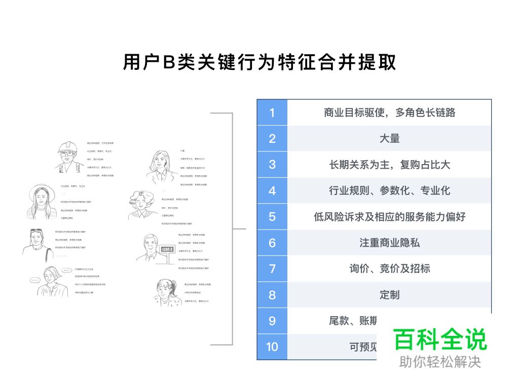 我们先将其B类关键行为特征进行梳理罗列,再将类似的特征进行合并后并归纳抽象,根据出现频率和典型性重新整理,推导出B类电商买家10大关键特征: