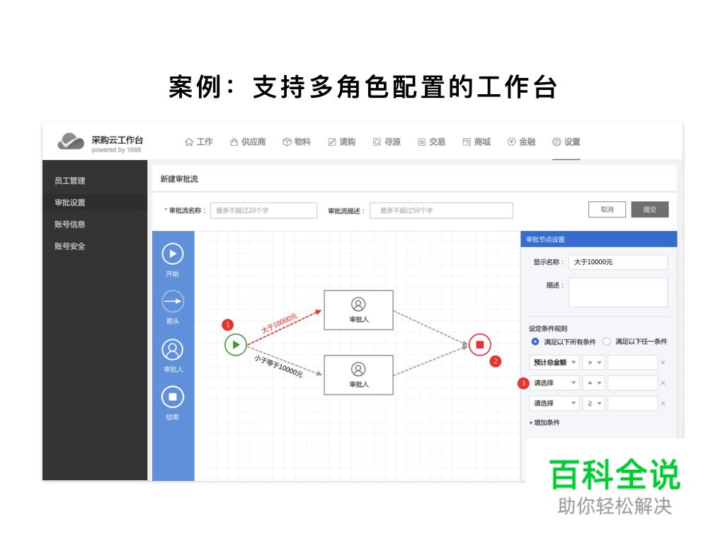 刚才提到的B类电商采购流程中涉及的多角色,我们设计了可配置的工作台,允许对采购流程、角色、权限及子母账号进行配置,充分满足企业多样化的要求。