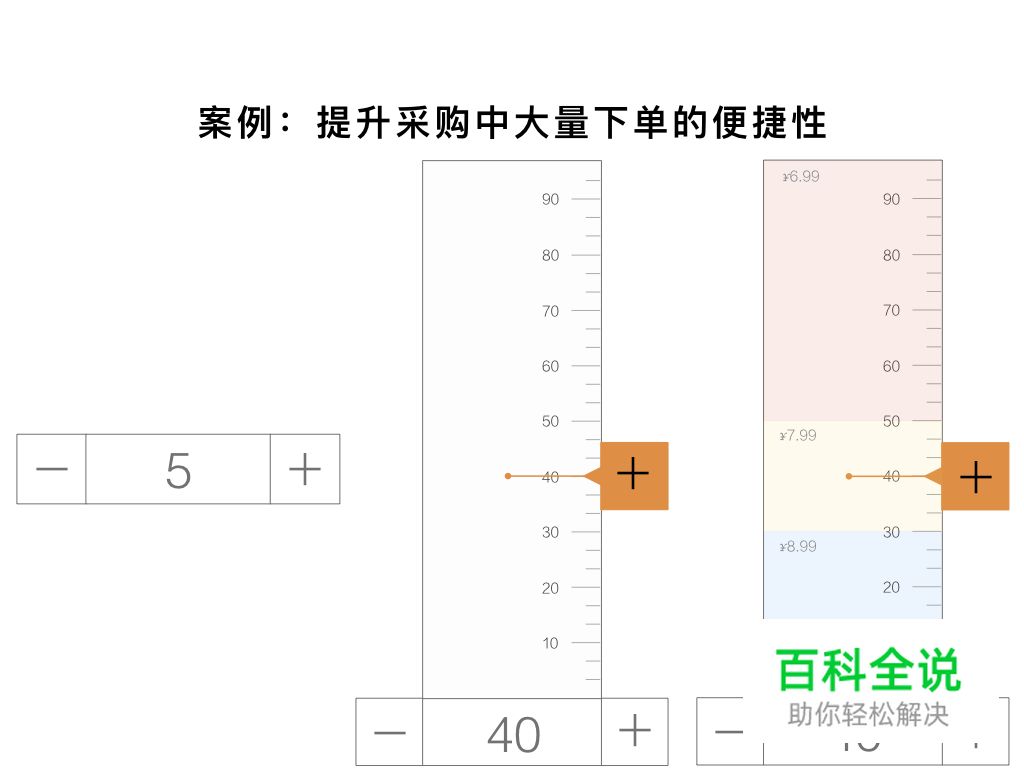 为了减少用户在手机端进行数字录入操作,我们希望用户更多通过点击和拖动方式来完成输入交互。首先,用户可以通过数字步进器一步定位到起批数量,而不用多次点击。其次,长按数字步进器后用户可以在弹出的数字标尺中快速定位目标数量范围,然后再逐个点击微调。最后,我们将不同数量范围的阶梯价格在数字标尺中进行显示,用户在选择采购数量时能更直观方便的进行决策。