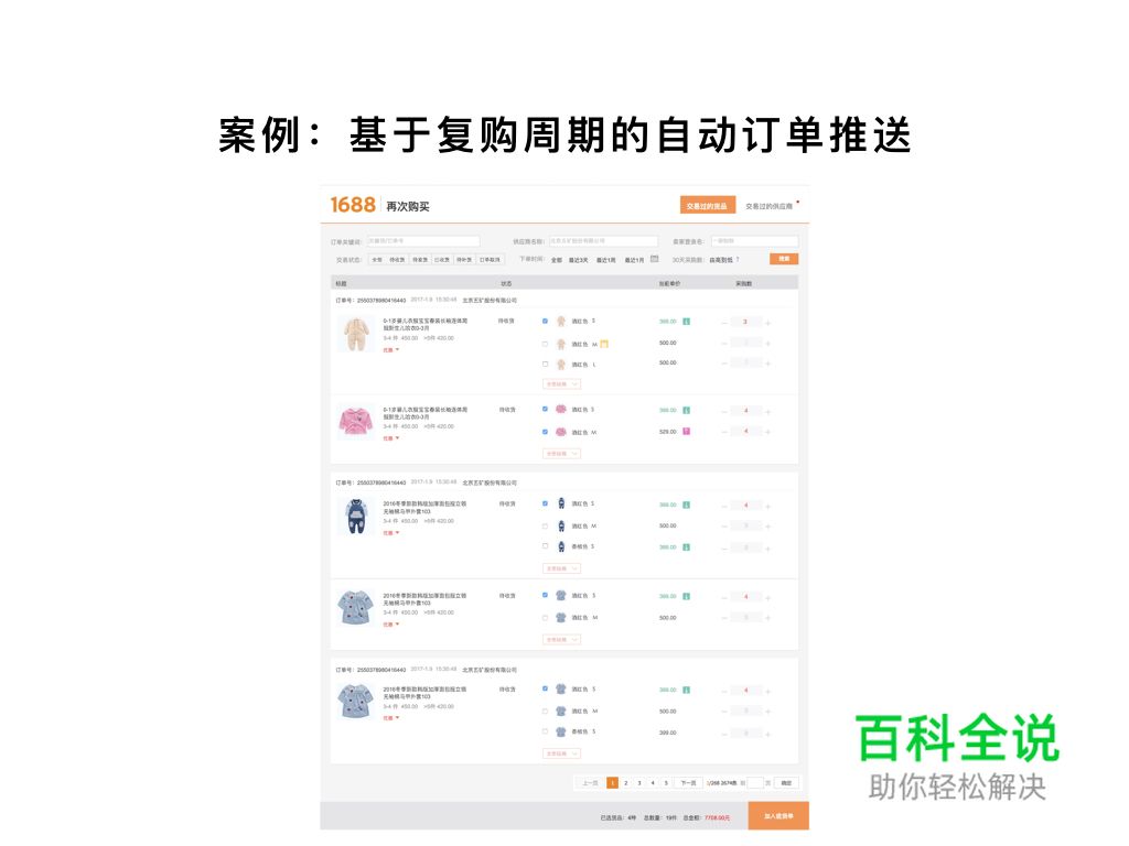 既然B类电商用户普遍存在复购行为,我们不仅将复购工具布点在已买到订单、首页工具条等关键路径上,而且根据货品与供应商维度对复购工具形态做了分类定义,同时抽取买家周期性复购的商品组成订单,在下个复购周期前自动推送给买家,降低买家重复操作成本。