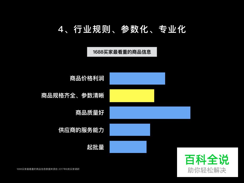 买家在1688平台最看重的商品信息中,除了质量、价格及服务能力之外,对商品的规格齐全、参数清晰也有很高要求。