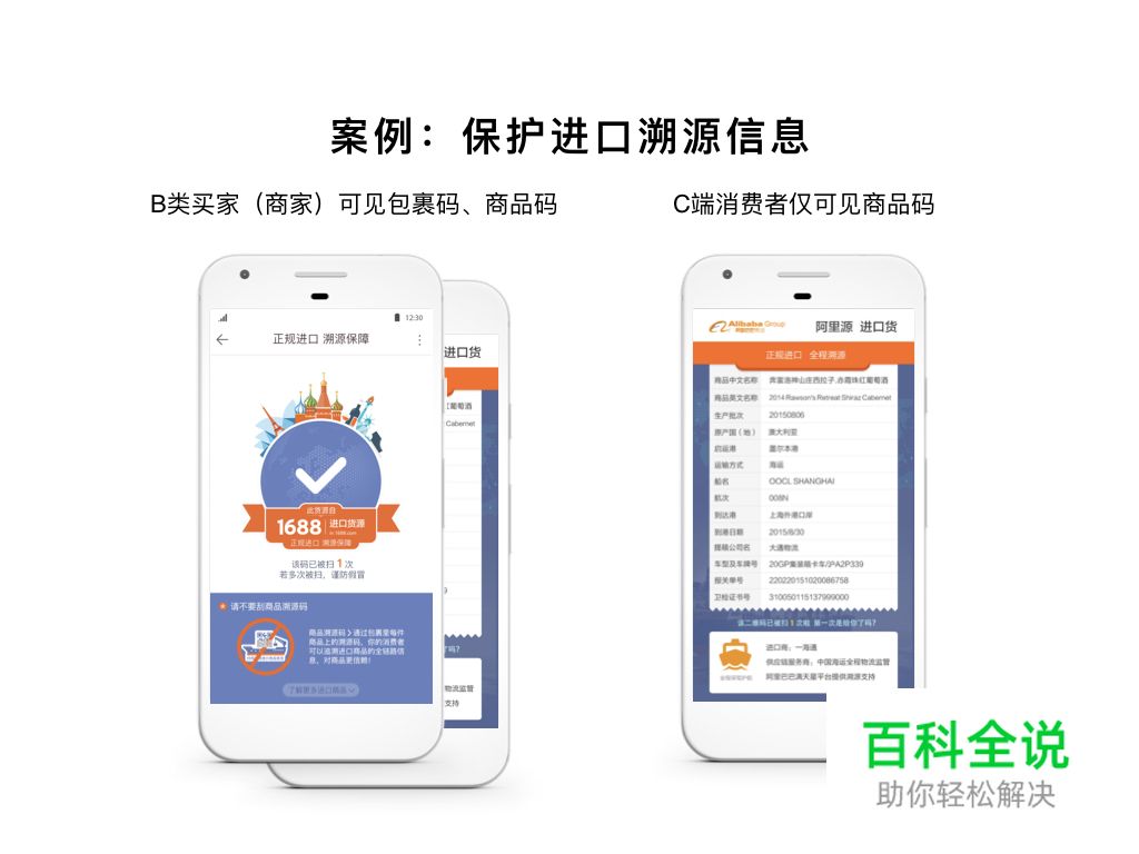 进口业务中有2种溯源码:包裹码和商品码,前者用来确保包裹来自1688平台(有品质背书),后者用来确保商品来自海外源头厂家。B类买家收到包裹后先由商品码了解商品品质等源头信息,再通过包裹码确认商品来自1688平台,然后对包裹码进行“阅后即焚”,避免C端消费者知道商品是1688平台进货。C端消费者收到货后只能看到商品码,同样是扫码了解商品品质等源头信息。
