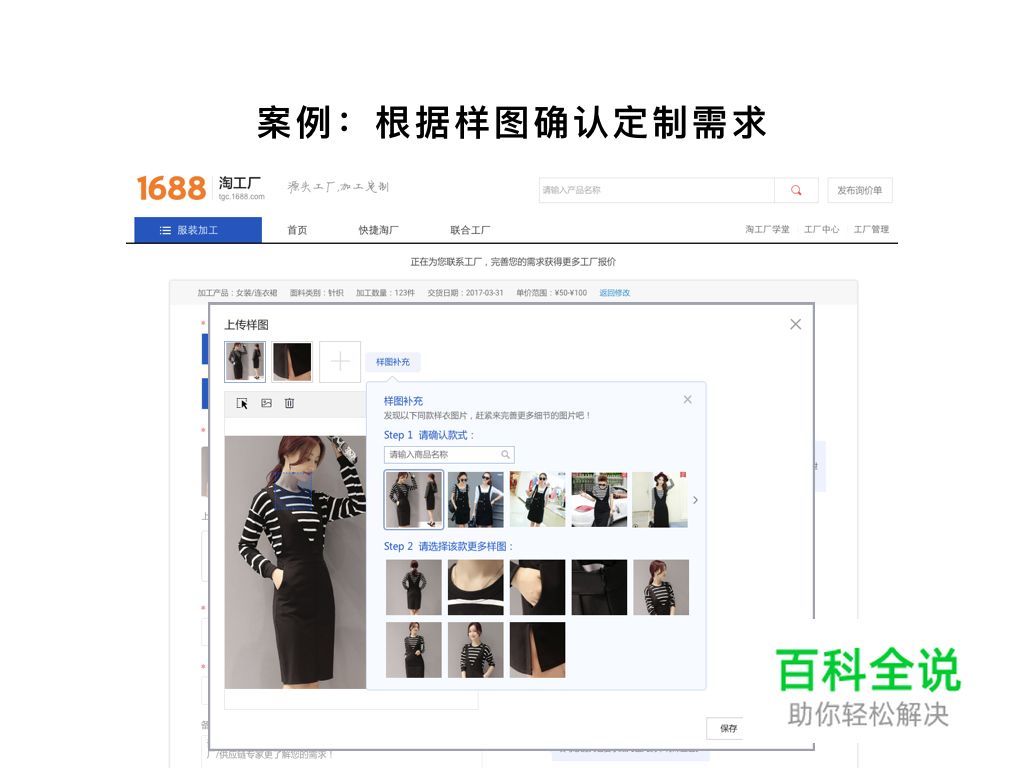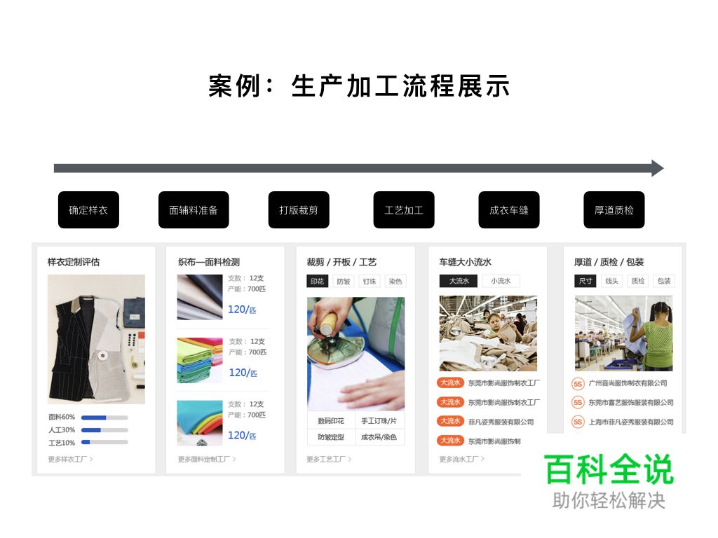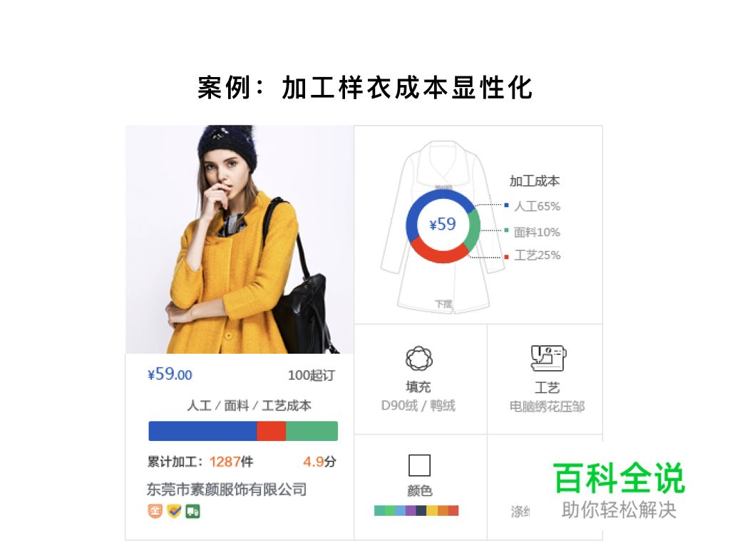 在展示定制厂家提供的加工样衣时,通过对其成本的拆解、加工工艺甚至生产加工流程的说明,帮助定制买家进行加工需求决策。