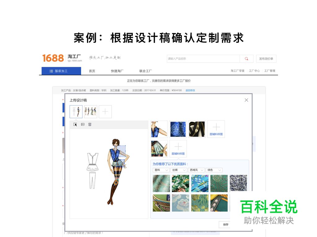 在淘工厂业务中发布服装加工定制需求时,既可以上传设计稿也可以上传样衣图片。允许用户勾选设计稿中的定制关键细节,后台进行面料及图案的自动匹配,或者通过对样图的识别自动寻找相同款,极大的降低了用户定制需求的录入成本。