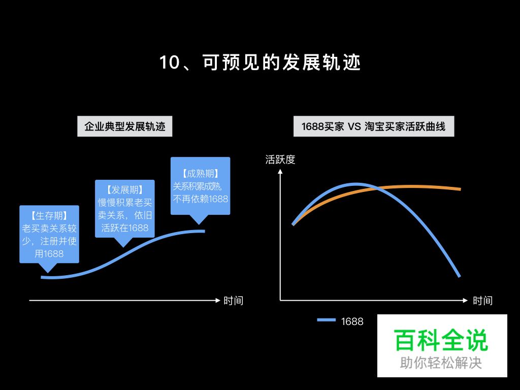 企业发展有生存期、发展期和成熟期三个阶段,在1688平台上典型的发展轨迹如图中所示。同时,买家用户在1688与淘宝上的活跃曲线有明显差异,随着时间增长,买家在1688上会逐渐变得不活跃,而在淘宝上则持续稳定在较高的活跃度。